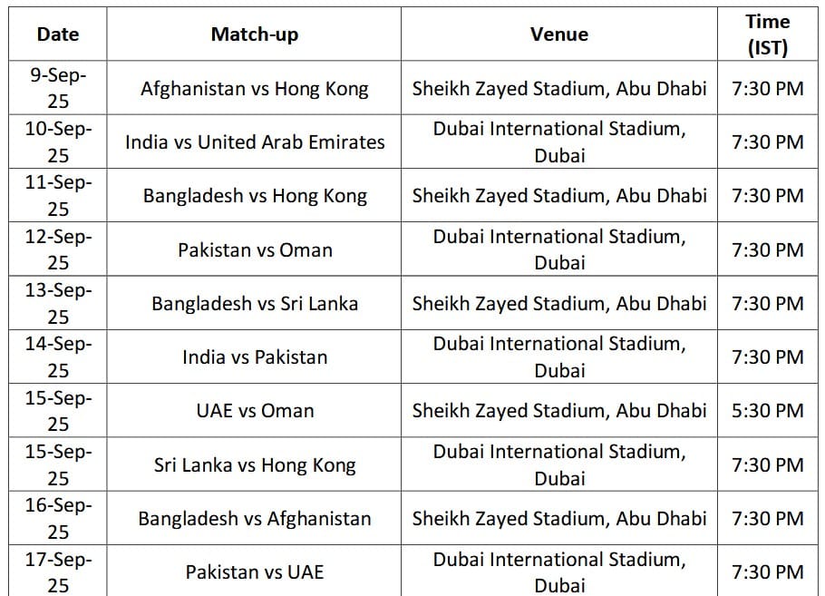 | 9-Sep-25 | Afghanistan vs Hong Kong | Sheikh Zayed Stadium, Abu Dhabi | 7:30 PM |