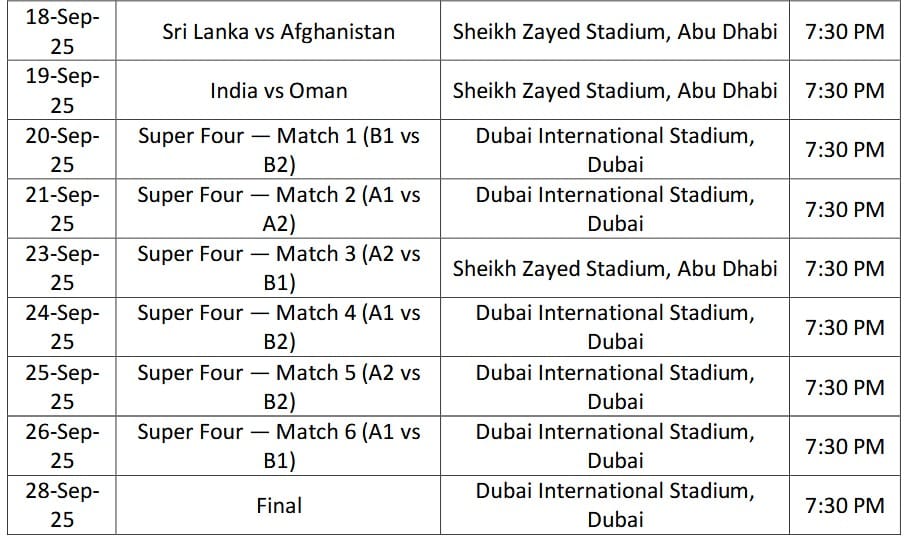 | 21-Sep-25 | Super Four — Match 2 (A1 vs A2) | Dubai International Stadium, Dubai | 7:30 PM |